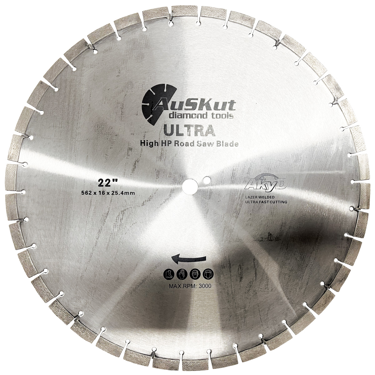 Our 22″ (562mm) concrete blade features laser-welded segments and delivers top performance, durability and precision, while offering outstanding value for money. Designed for fast cutting in hard reinforced concrete, this blade features 16mm high x 4.2mm wide diamond segments with the latest in AkyD technology (features controlled layered diamonds set at a 45-degree angle for faster cutting speeds and extended blade life) for 42-65HP use on road saws.